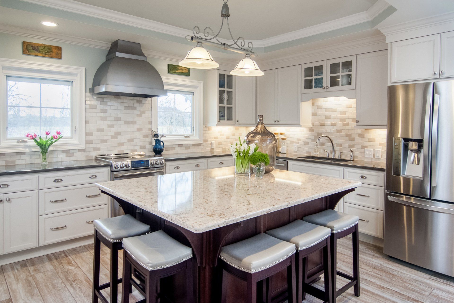 Quartzite colors are limited to neutral tones like white, gray, and beige, but pair exceptionally well with light or dark cabinetry.